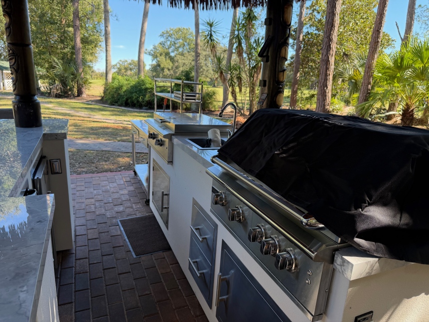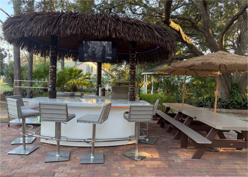 We have FOUR kitchens (2 indoors, 2 outdoors!). The estate's most recent addition is this new outdoor Tiki Bar kitchen featuring a thatched roof, hibachi cooktop, large grill, wine cooler, mini fridge, Bluetooth sound system, and overhead TV.